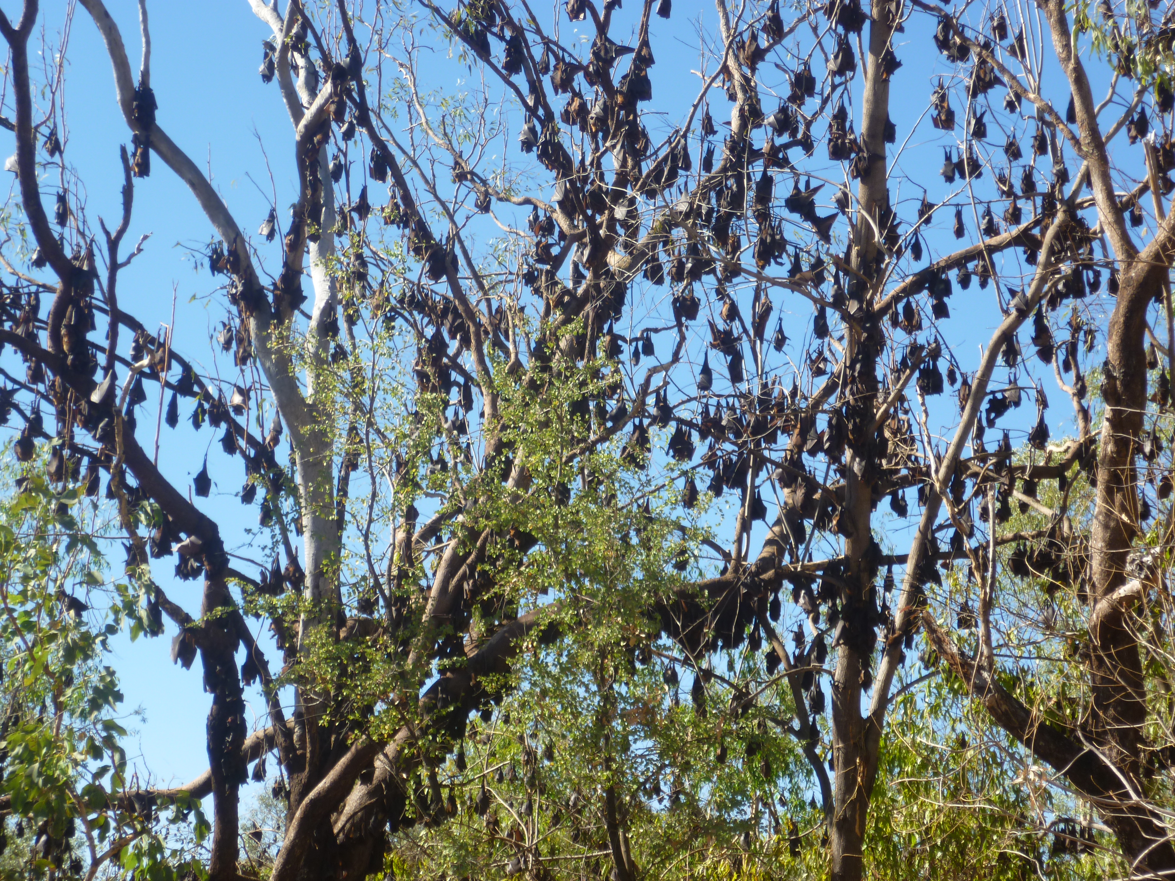 Bats dripping from the trees, sometimes in bunches. Some flap their wings to cool themselves, a quiet round of applause. Some just can’t keep still, scrabbling around to find the perfect hanging spot. At night they wheel silently around in the sky and then in the morning the whistling Whistling Kites take over.