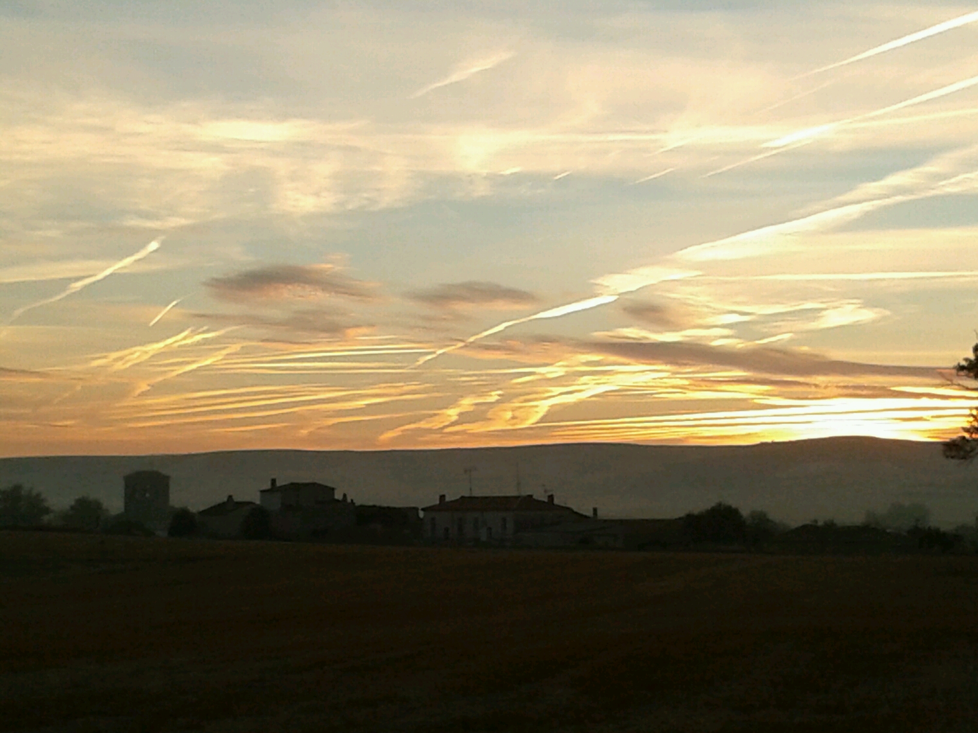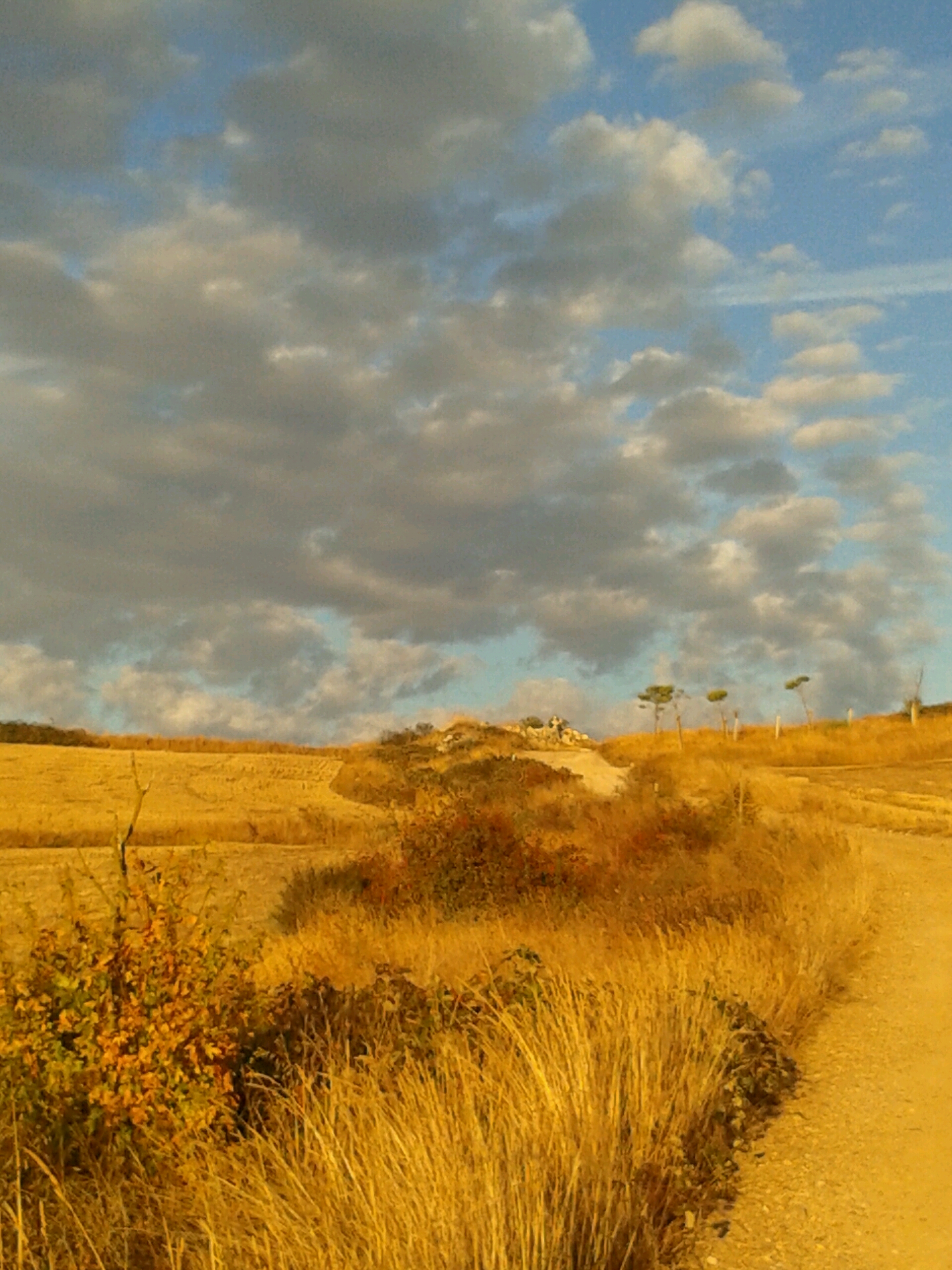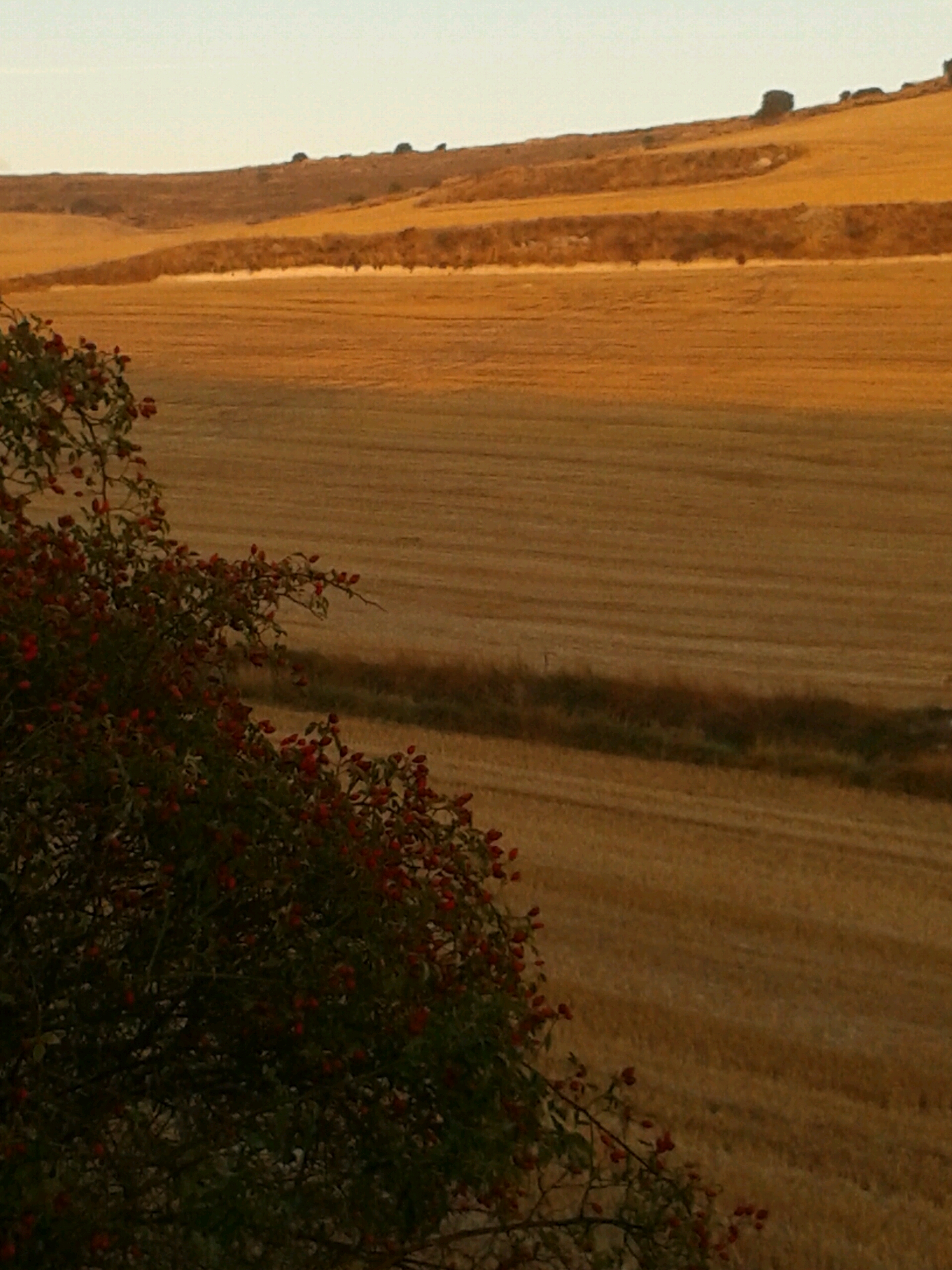 Before the sun rises the sky is a mix of pastel shades, but always with criss crossed lines where planes have left scratch marks of colour across the pale blue awakening sky: in this picture the lines are white and other days they are soft pink or lavender. As the sun rises, the farmed and cropped landscape contrasts beautifully with the dark red berries that line the path. But give the sun another half an hour and it paints the fields and dry grass with a spectacular golden glow. Early morning on the Meseta: a stunning time of day.