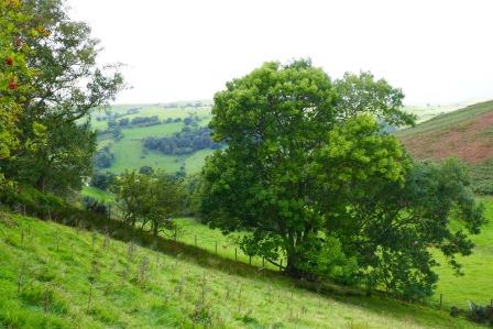 There was more reminiscing as we started our walk from St Asaph to Llansannan: there’s the street where we grew up; the shop where we bought lollies and the cottage where our grandparents lived etc etc. Gradually, memories gave way to new territory and we were continually surprised at the density of tracks and lanes that we never knew existed. The landscape on today’s stretch featured: farmland fields in steep-sided valleys dotted with trees and the occasional patch of purple heather; swathes of lush emerald pasture grass that hides the ankle-wrenching holes pugged by heavy-hoofed livestock; darkly-shadowed and secretive paths that connect different worlds and hint of ancient ways; rows of neat cottages primly posed to gaze on secluded valleys; and the Afon Aled that flowed fast and was coloured chocolate with the soil load of the previous day’s heavy rainfall. The day’s tally in regard to the weather was countless scudding clouds, several bouts of strong wind but only one serious downpour. This type of weather offers a bonus and there is always a moment of joy when the greyness of the sky opens up and permits a shaft of light to momentarily illuminate some small portion of an otherwise muted landscape. As I write the blog, the rain is battering on the windows and each drop sounds like the amount carried by a cup: large, heavy and plentiful, these drops will puddle the surface of the already saturated ground and I know that tomorrow our feet will quickly be as sodden as the field.