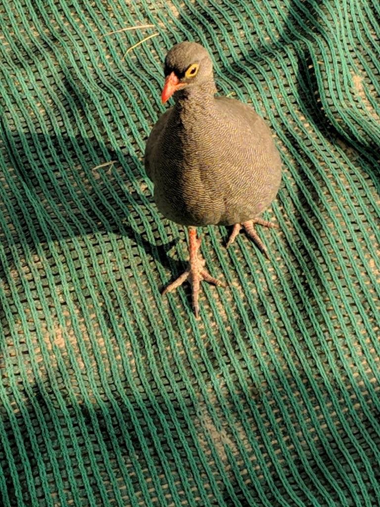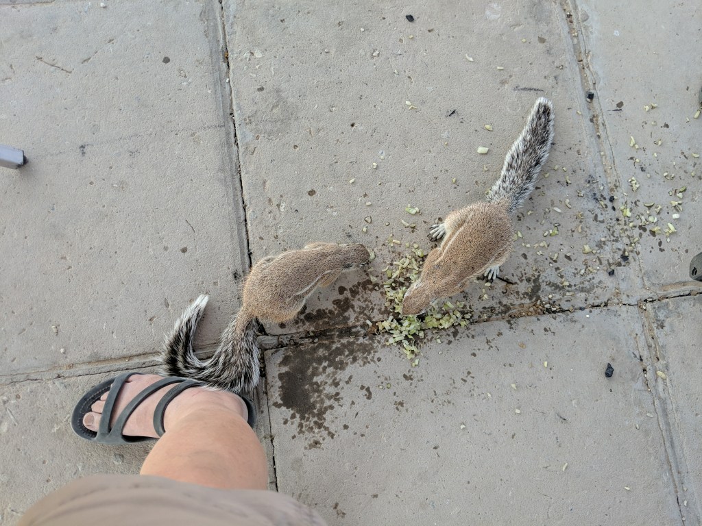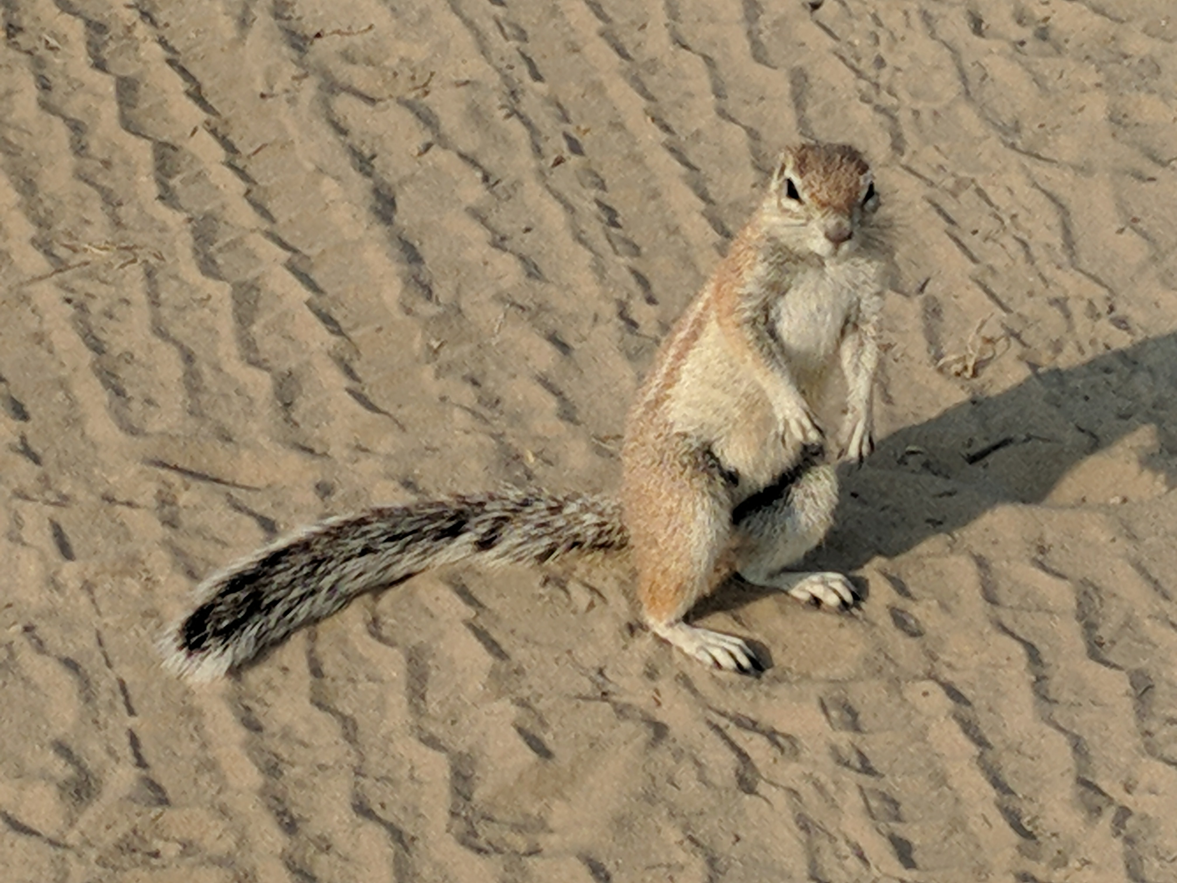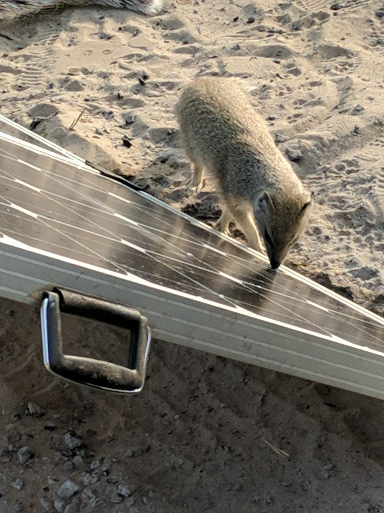 On arrival, the bush telegraph spread news that Mabua Site 04 was now occupied. Parched and eager for moisture and the possibility of food scraps, our presence proved popular. A pair of African ground squirrels offered the first welcome, closely followed by more squirrels, a group of yellow-billed hornbills, yellow mongoose (plural) and native bees. A large of group of guinea fowl raced in shortly after, milling around in a somewhat miffed state that they were a little late to the party. Clearly accustomed to humans in their territory, this menagerie of camp residents were ready for any offerings. As the set up tasks included a rinse of the dusty solar panels, the squirrels and mongoose were quick to suck at the small droplets of moisture before they evaporated from the panels. Steps into the camper proved irresistible for the lone red-billed spurfowl, and banana skins seemed to simultaneously attract and spook the guinea fowl. In the end it was the omnivorous squirrels that proved the most adaptable to our offerings. Happily disposing of small pieces of overripe avocado and making the most of the fried onion and garlic that was spilt from a small cooking disaster. When we have moved on, I’m sure the clean up crew will rapidly erase all evidence of our presence, tidying up their backyard before the next humans roll in.
