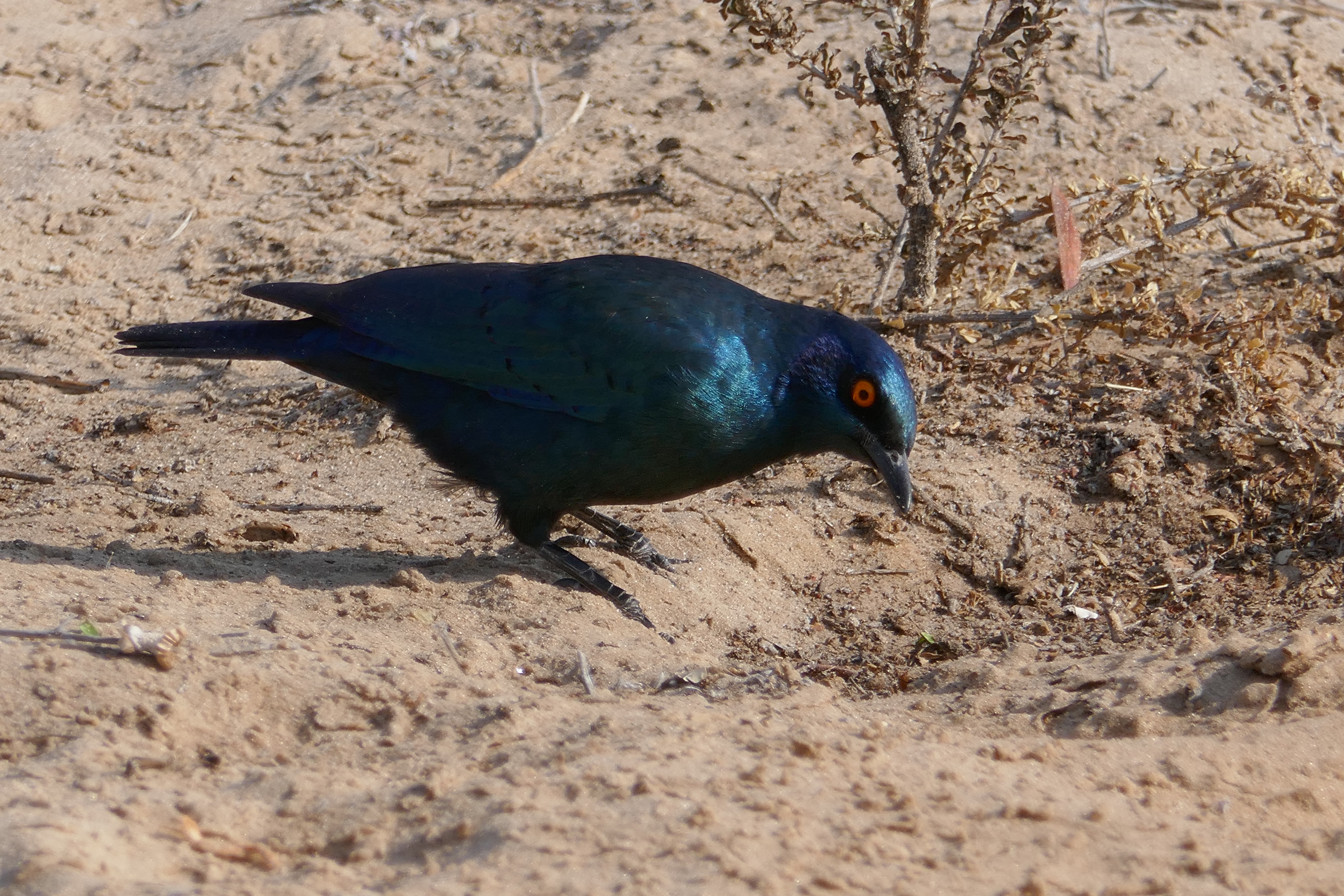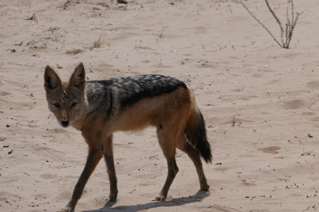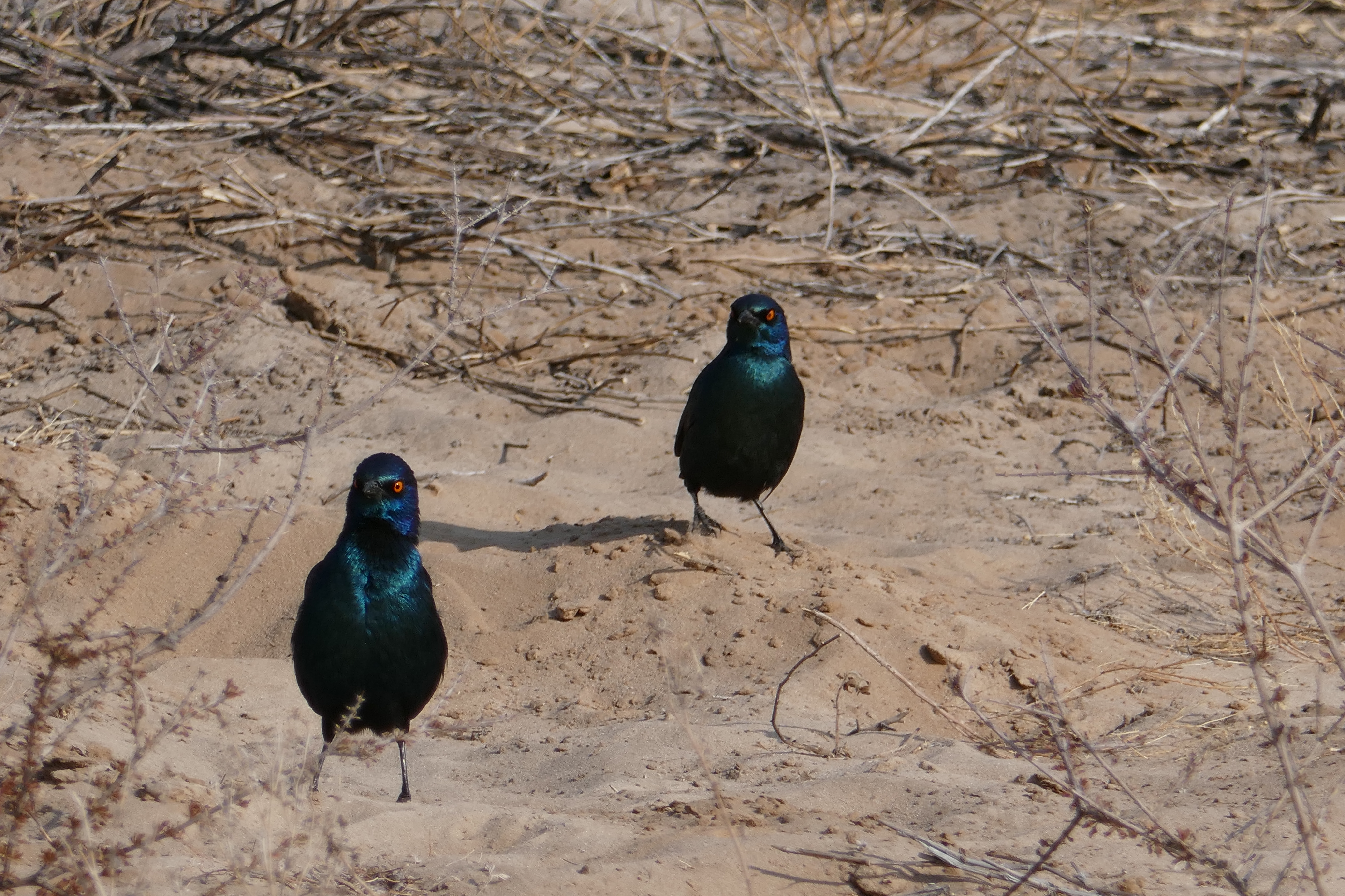 Just like Mabuasehube had a set of characters that picked through our meagre food scraps, so too at Kaa camp. A group of Cape starlings squabbled among themselves for the chance to peck at a sandy apple core. Their impossibly iridescent feathers shimmering through blue, green and purple as they moved under the bright sun. Seen face on, their accusing red eyes seemed to make statements of complaint about the disappointing offerings. In contrast, a loan black-backed jackal sloped gingerly around the camp on delicate, slim legs. A wannabe scrounger, venturing close when you turned your back but finding nothing of sufficient interest to satiate its hunger.