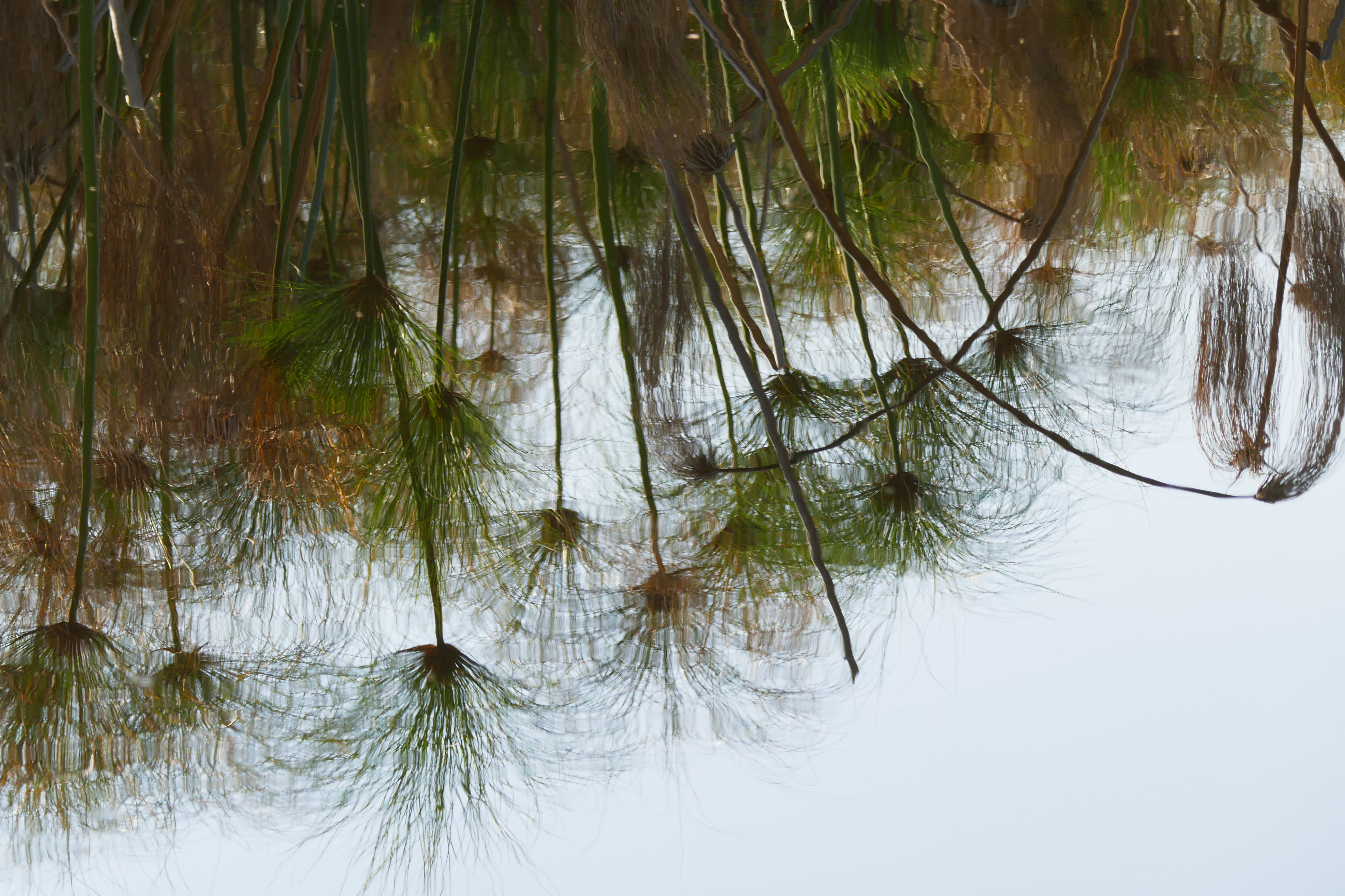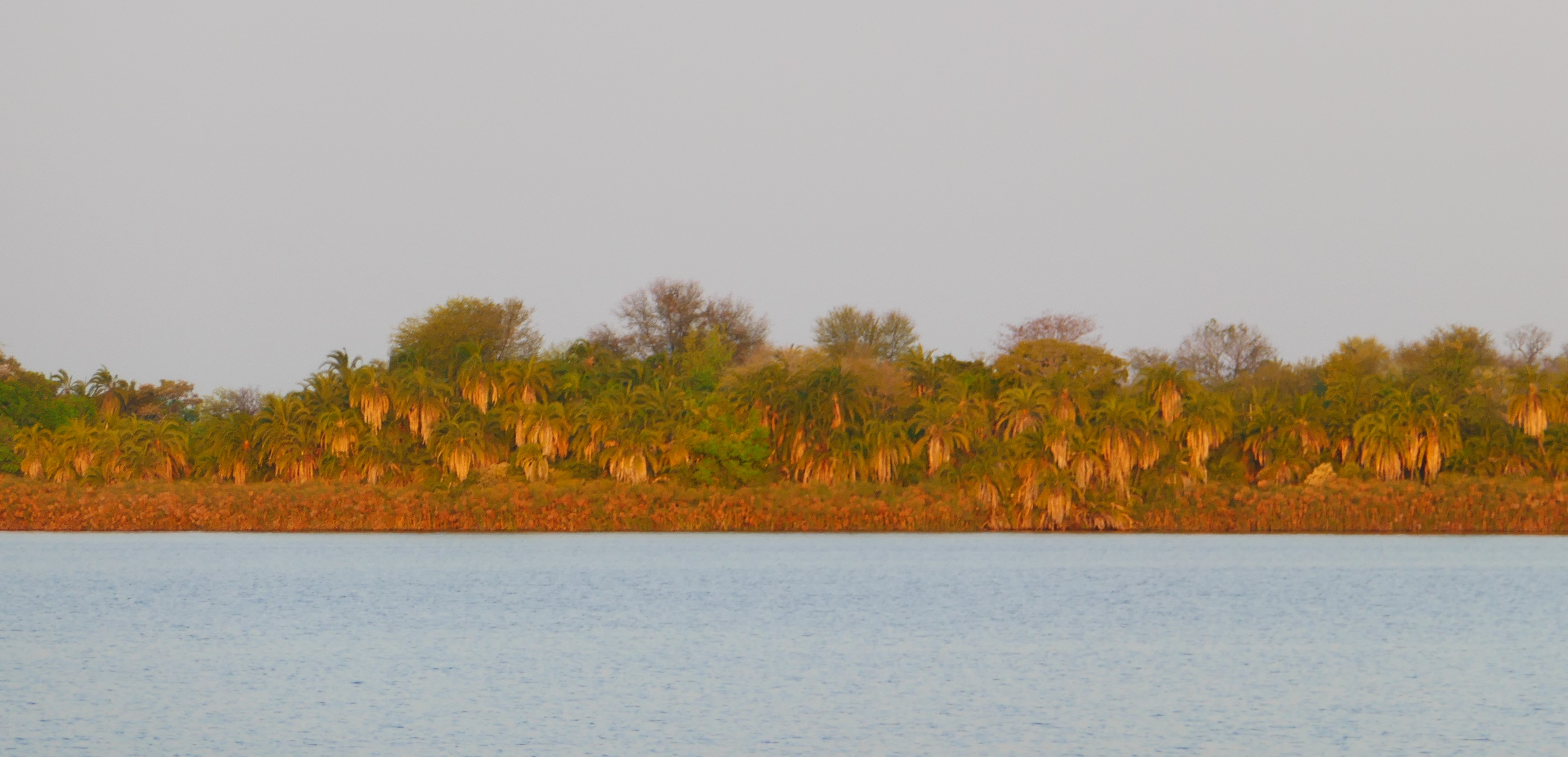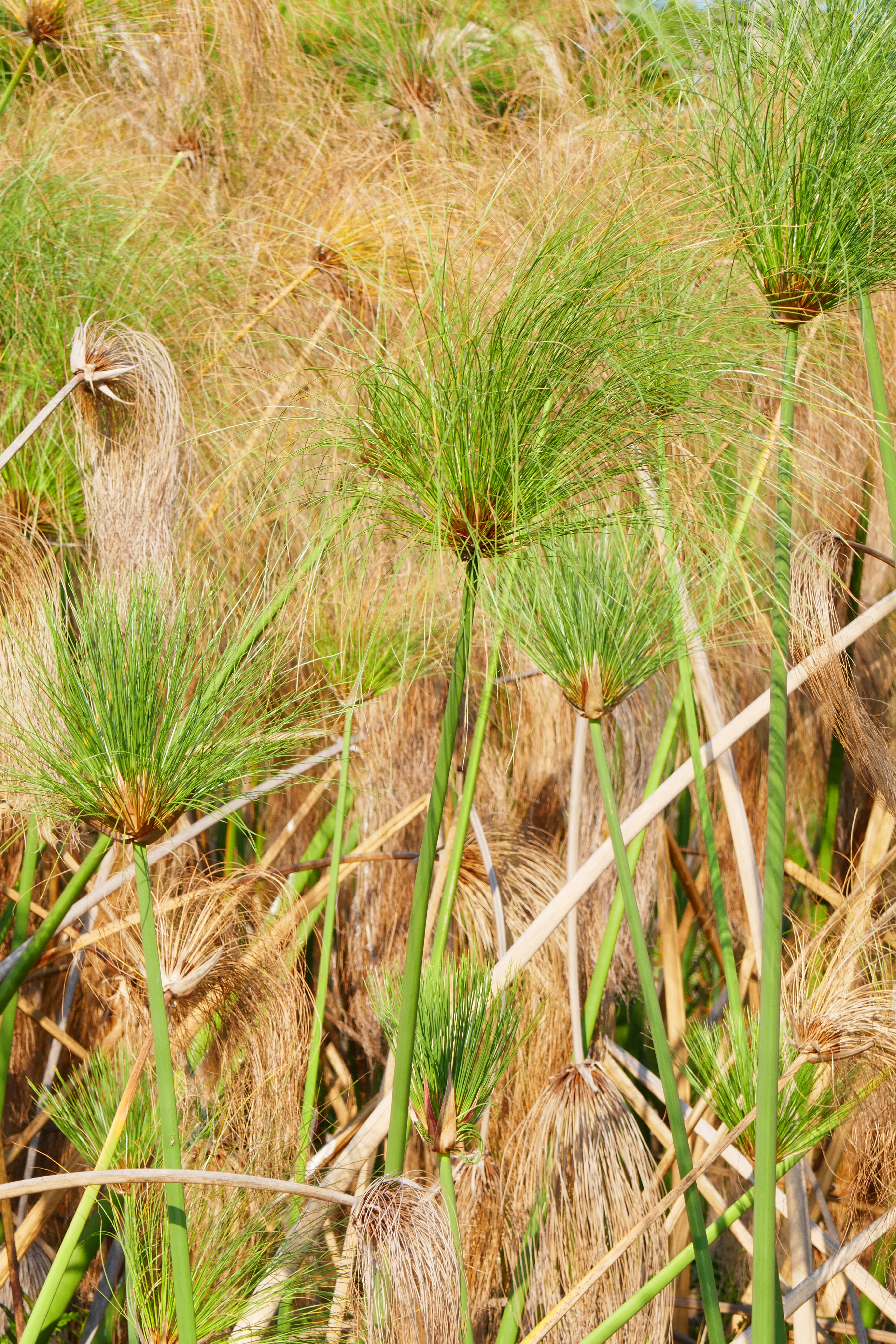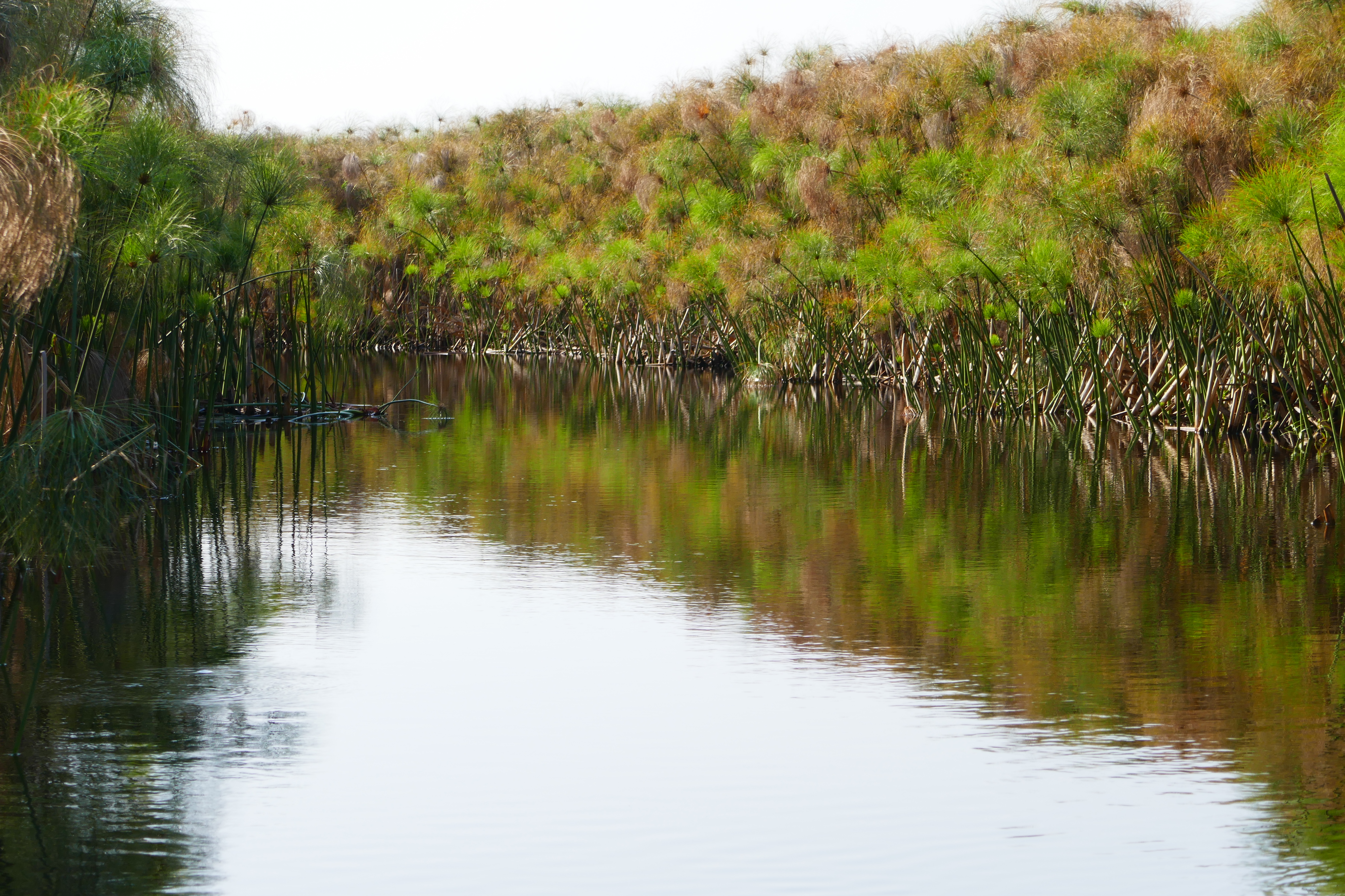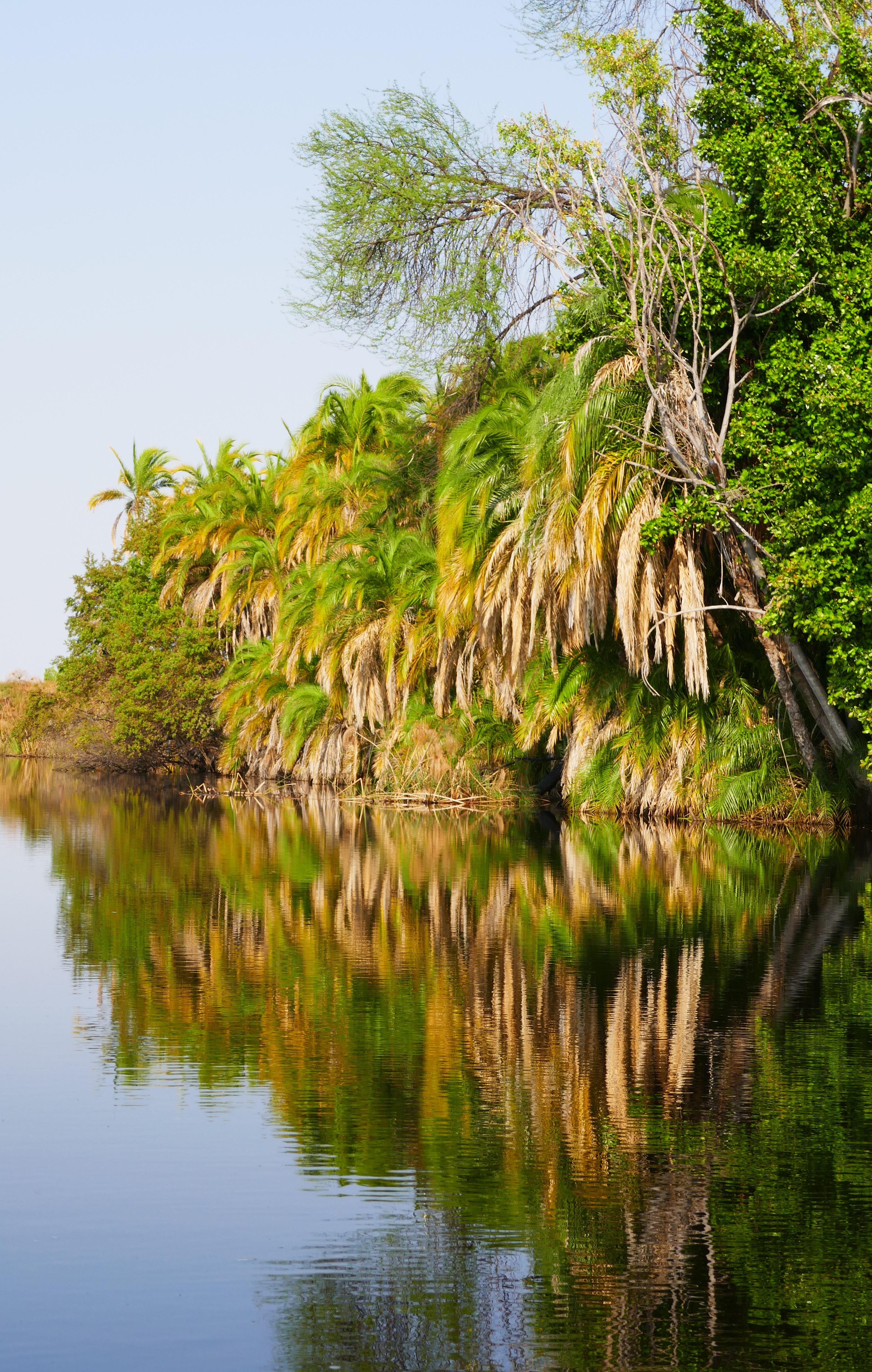 A green and golden strip of dense fringing vegetation, reflective palms, and towering papyrus with stems as thick as your forearm.