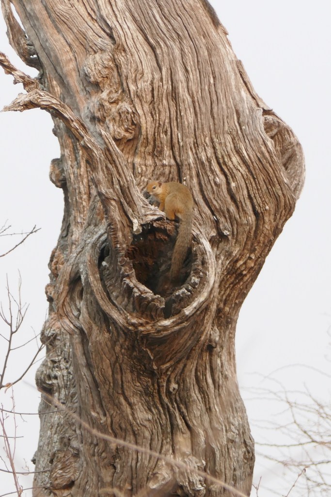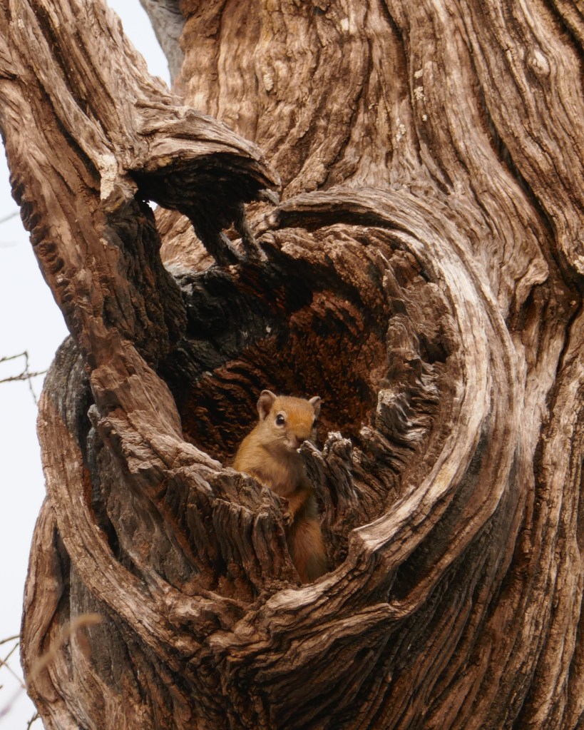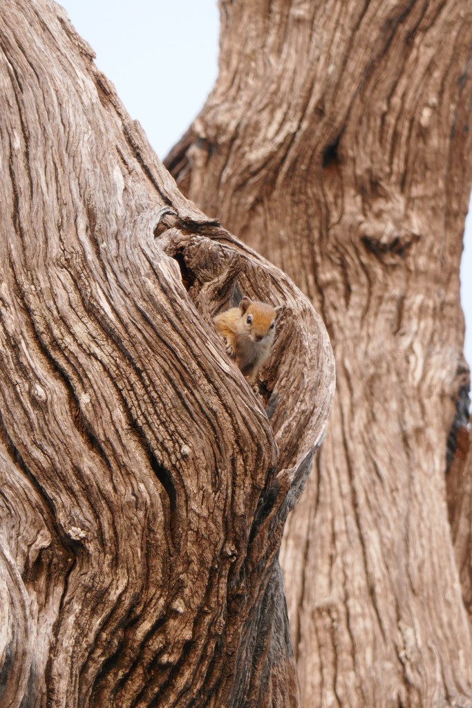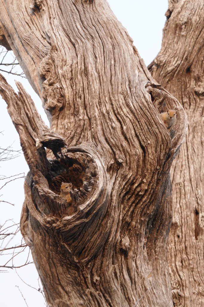Something was moving about on a dead tree in the distance. Closer inspection revealed a pair of ground squirrels, which kept darting around the trunk and disappearing. They’d appeared and disappeared several times until I realised they were hiding in a couple of knurled hollows on the other side of the trunk. The game of now-you-see-me-now-you-don’t continued while they were in turns curious and nervous. So cute and entertaining. Eventually I left them in peace, taking my camera off to hunt birds instead.