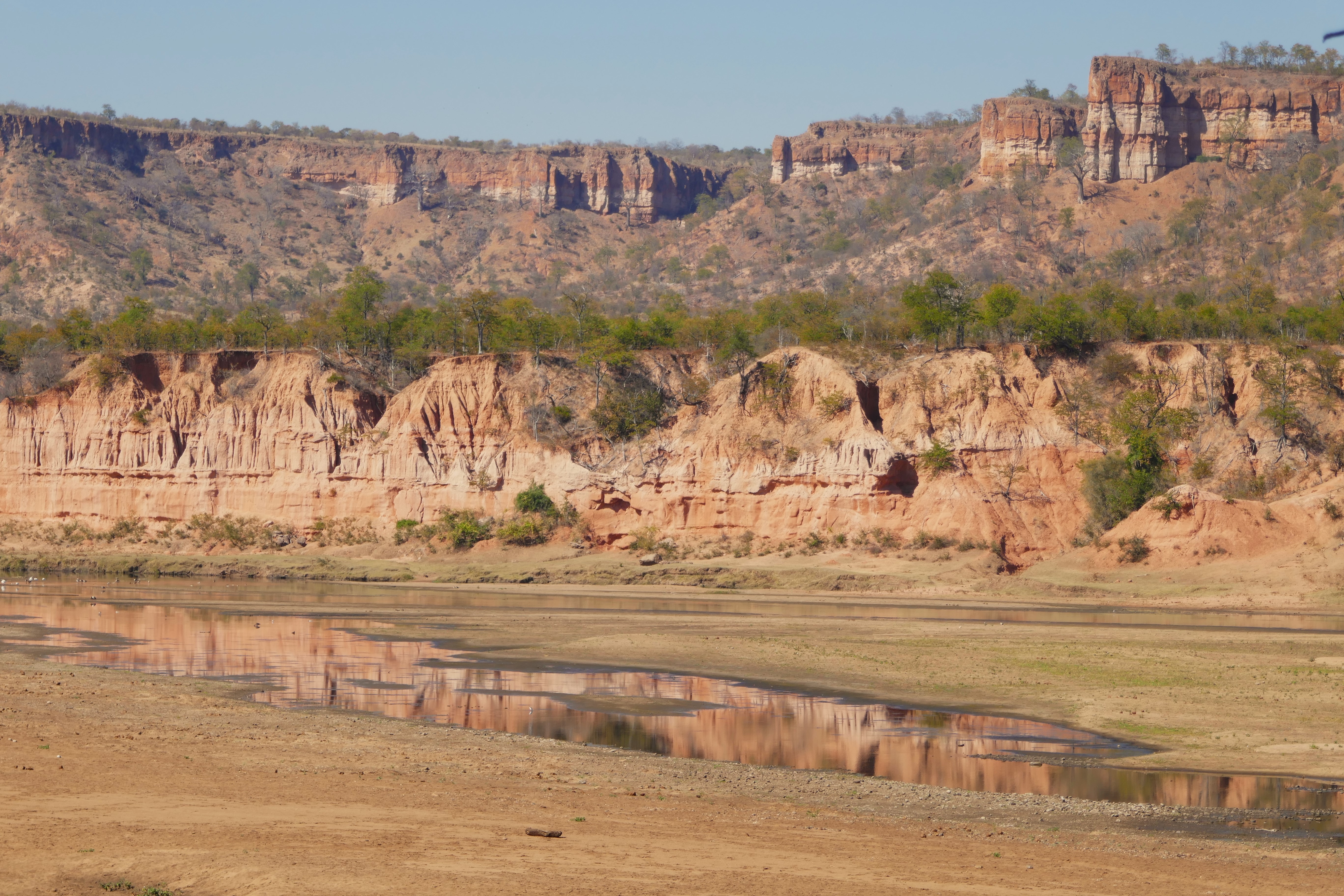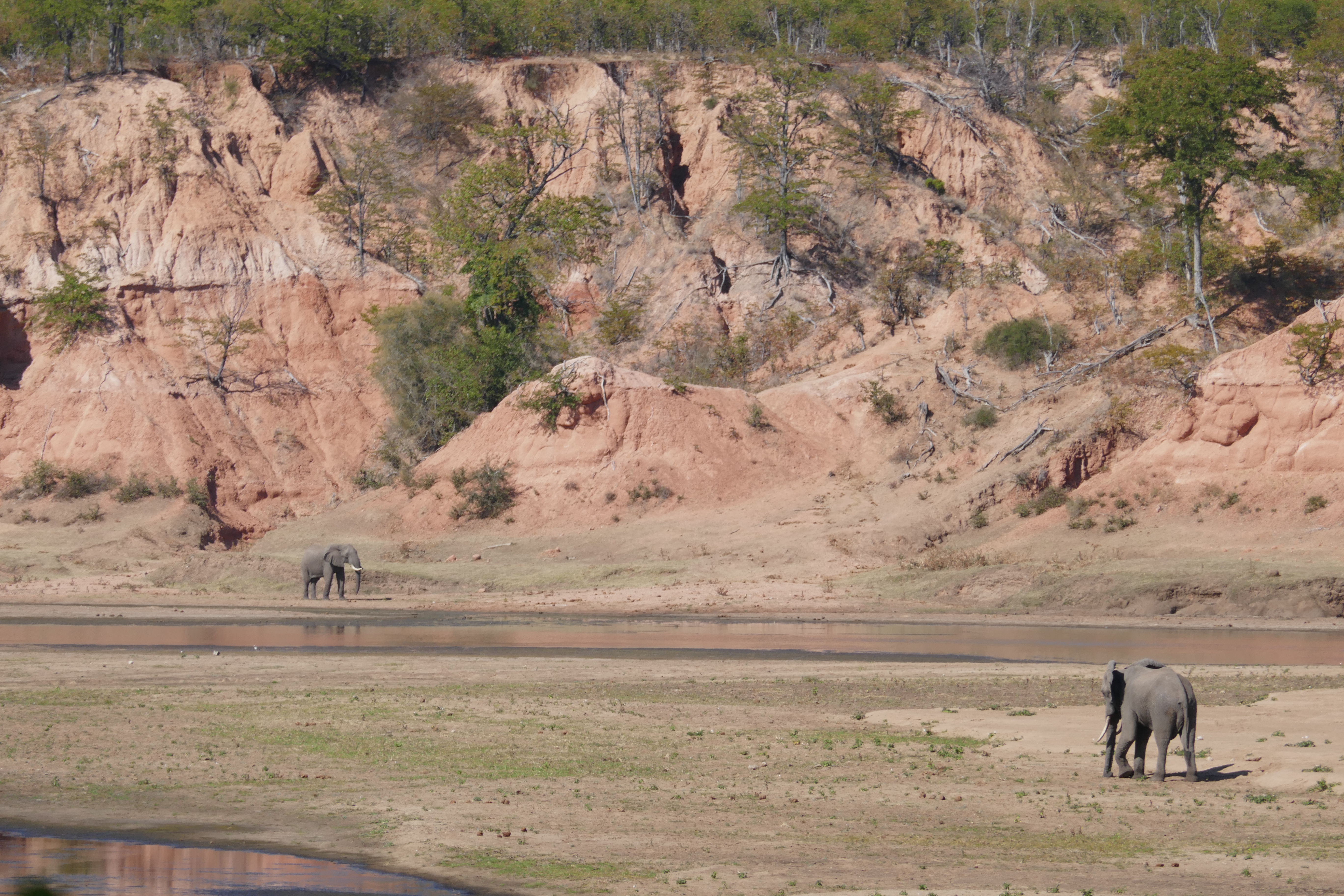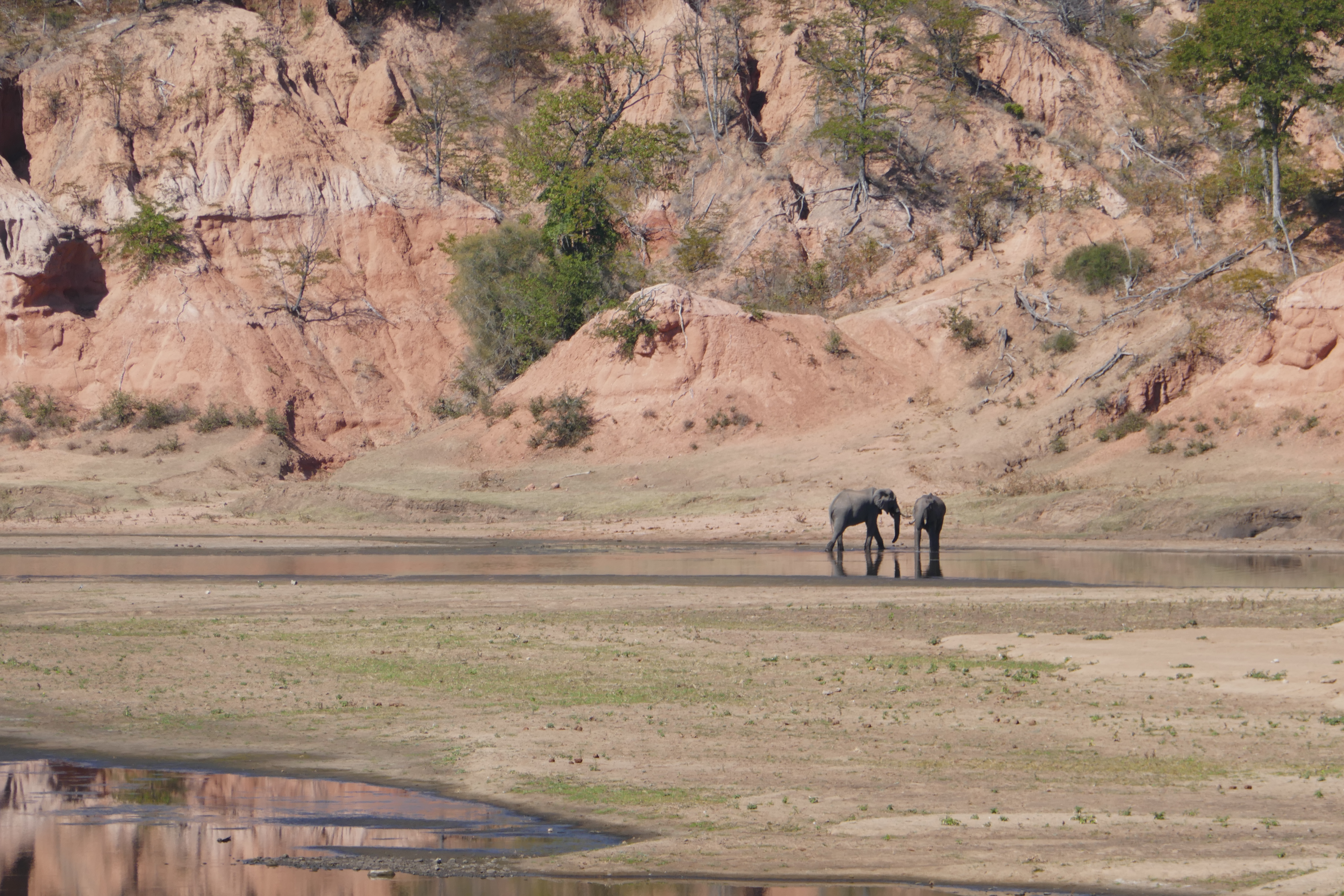 In the winter season, the Runde River weaves across the sandy bed in thin threads,  separating, rejoining and separating again. The Chilojo Cliffs tower above, an iconic feature of Gonarezhou National Park. Dwarfed by the escarpment that dominates the landscape, wildlife go about their daily business. Hippos wallow in the pools that are sufficiently deep to swallow their bulk, heaving themselves out to warm when needed. Grey herons, white-crowned lapwings, yellow-billed storks and other more diminutive waders (read, unidentified!) step delicately and patiently in their search for sustenance. As usual, it is the elephants that grab your attention, walking leisurely across the sand: sometimes casually draping their curvaceous trunk over a tusk or pausing to spread their ears in recognition of another of their species emerging on the opposite bank. They’re on Africa time and there is no hurry. Eventually one reaches the water and drinks while the other avails of a muddy scoop hole to splash mud over its body. They pass by each other with one briefly extending its trunk towards the other but not quite close enough to touch. The muddy scoop hole is revisited by both and they then return slowly to their respective river bank. Even the elephants seem small and vulnerable in this immense landscape.