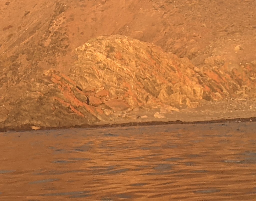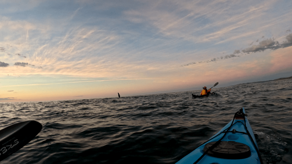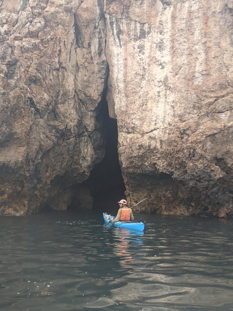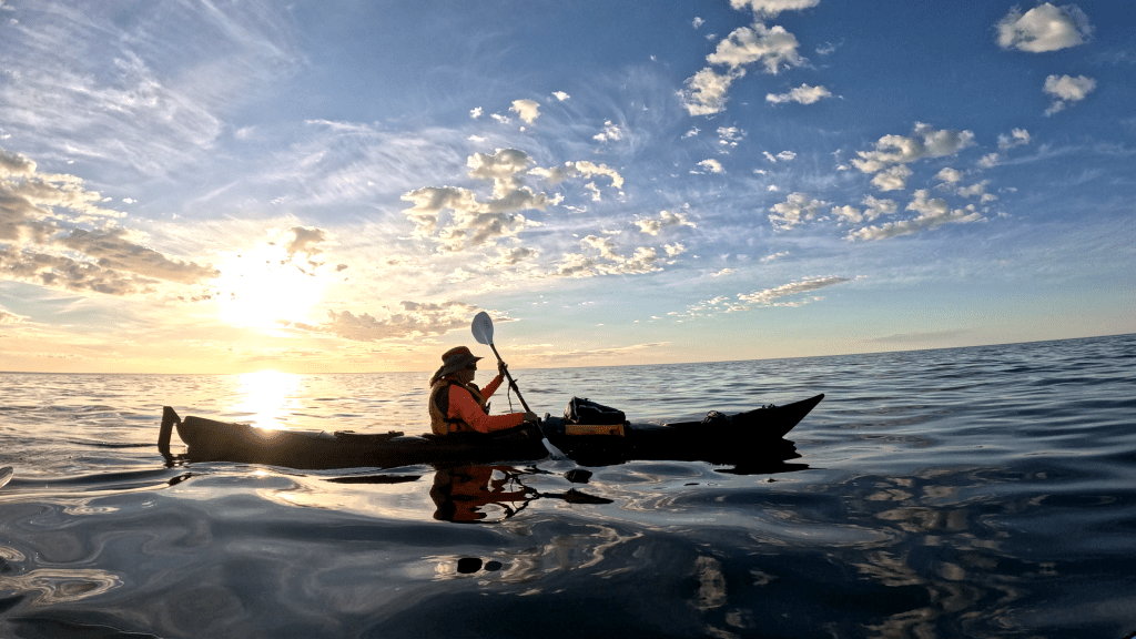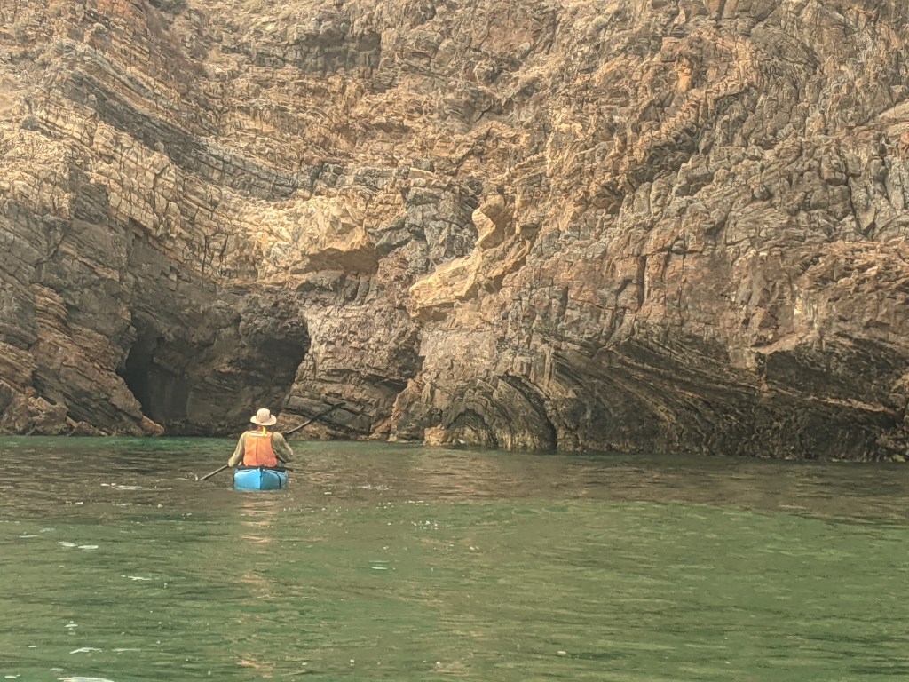 Autumn often produces the best weather in South Australia, but it was extra special the week of our April kayak trip along the western coast of the Fleurieu Peninsula. Paddling for 5 days from Cape Jervis to Aldinga Beach, I was smitten by the clarity and calmness of the water and, like a well-worn record, I was regularly moved to comment on the glassy surface that is so pleasurable to paddle through. Layered and contorted rock formations were regular features of the trip, with some glowing golden in the late afternoon sun and reflecting their goldenness onto the coastal waters. Towards the end of our first day on the water, and with the sun dipping below the horizon, we were paddling with some determination to reach our designated beach for the night. Approaching Cape Rapid, a slapping sound caught our attention … and again and again we heard the sound until we eventually saw a long upraised flipper like a salute that commanded attention. Two whales!* We had made an error in locating our beach so we had to turn back and pass the whales again. This time they crossed in front of us with one breaching barely 10m away, which was closer than you might want but we trusted that the whales were very well aware of where we were. New Zealand fur seals were plentiful in the marine reserve south of Second Valley either basking on rocks or casually bobbing impossibly near the base of cliffs and rising and falling unperturbed by the swell. Landing on a beach was a somewhat precarious affair with the tiniest of waves having the power to turn your kayak over and prematurely deposit you on the beach (https://www.youtube.com/shorts/8OKy6_hNdsM). But the weather was warm enough that being soaked was no problem, and my landing skills were greatly improved by the end of the trip. This stretch of the coast is blessed with small, secluded beaches that are only accessible from the water, and some only by kayak. Small caves abound and creeping carefully into the dark you might find a capitaled “HELLO” left above the tide mark by a previous visitor. The coast is surprising and offers many delights and, as Greg kept repeating, it’s not more than 2 hours from South’s Australia’s capital city.
