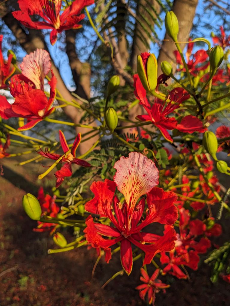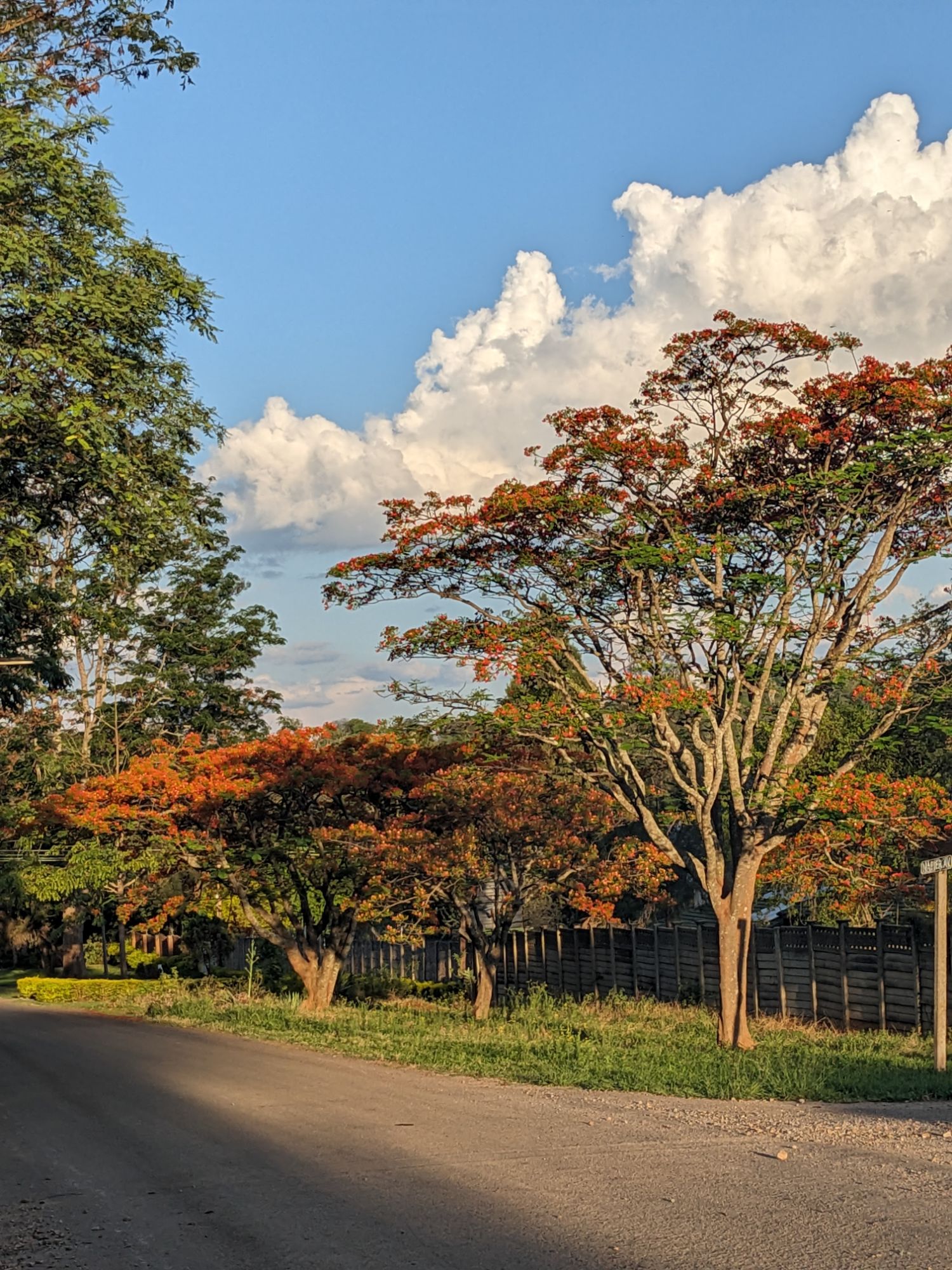 Back in Bulawayo, but in spring this time. A stroll around the neighbourhood reveals more vibrancy in the streetscape, with green verges and more and brighter leaves on trees. All contrasting with the dry winter period (https://parrygraph.com/2025/06/23/back-in-bulawayo/). Jacarandas and Frangipanis provide colour and fragrance, but the Flamboyant trees in full bloom are the real show offs. This tree is not native to Zimbabwe, but it’s easy to see why it’s a popular street tree: stunning flowers packed densely to create a red canopy; graceful arching branches that create ample shade; and the spent blooms littering the ground and providing further visual joy in their decay. Despite the best efforts of the beautiful early evening light, my photos do not do justice to these trees. I will keep trying to better reflect their beauty.